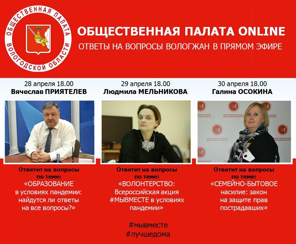 В прямом эфире члены Общественной палаты, являющиеся экспертами в своей профессиональной деятельности, готовы отвечать на вопросы вологжан по самым актуальным темам.