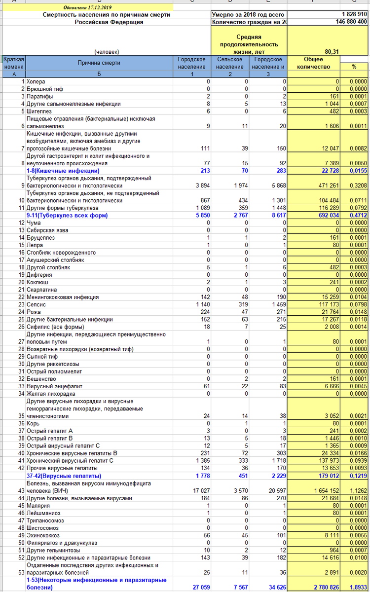Источник статистики — госкомстат рф, ссылка на эксель источник: https://gks.ru/storage/mediabank/demo24-2.xls Соответственно, как источник данных, будет использоваться только 2018 год, не самый плохой. Всего, на 2018 года, в РФ проживало 146 миллионов 880 тысяч 400 человек, по самым разным причинам, умерли 1 миллион 828 тысяч 910 человек. Просто посчитать смертность в % довольно легко, однако, с учетом количества граждан и количества смертей, мы можем вычислить, что теоретическая средняя продолжительность жизни, примерно 80,31 года. И понятно, что все мы когда ни будь умрем, но сколько людей из этих 146 880 400 человек умрут от старости, случайностей, болезней, если ничего не изменится в нашей жизни и медицине, то чего опасаться и где нужно обратить наибольшее внимание и осторожность? От всяких ужасов, включая холеру, гепатиты и ВИЧ, могут умереть — 2 миллиона 780 тысяч 826 человек (1,8933%), из них, большая часть вследствие ВИЧ — 1 миллион 654 тысячи 152 человека (1,1262%). От зло