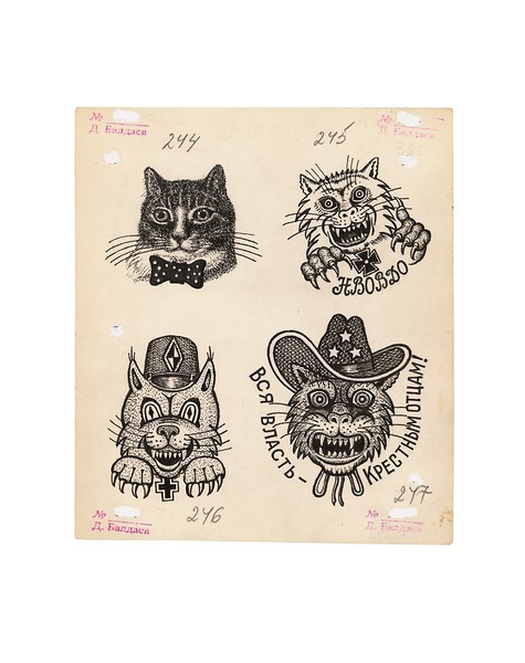 Различные татуировки кошек. Кошка является одним из древнейших символов преступного мира. Они олицетворяют воровство, благоразумие, терпение, скорость их действий, их безжалостность и ярость. В то же время они представляют ожидания своих жертв. Аббревиатура KOT, встречающаяся в татуировках, является языком воров, что означает: Коренной Обитатель Тюрмы. Вверху справа: текст читается как «НВОВДО». Это редкая аббревиатура, понятная только посвященным: НВОВДО - «Не трогай вора, он всегда заставит тебя сдаться!» 1950-х годов. Слева внизу: символы на шляпе, которые носит кошка, означают, что носителем татуировки является отрицатель - вор, который отказывается подчиниться и является злостным нарушителем тюремных правил. Справа внизу: текст гласит: «Вся сила крестным отцам!». Вверху: акроним расшифровывается как «Разделение хуже ада, когда ты