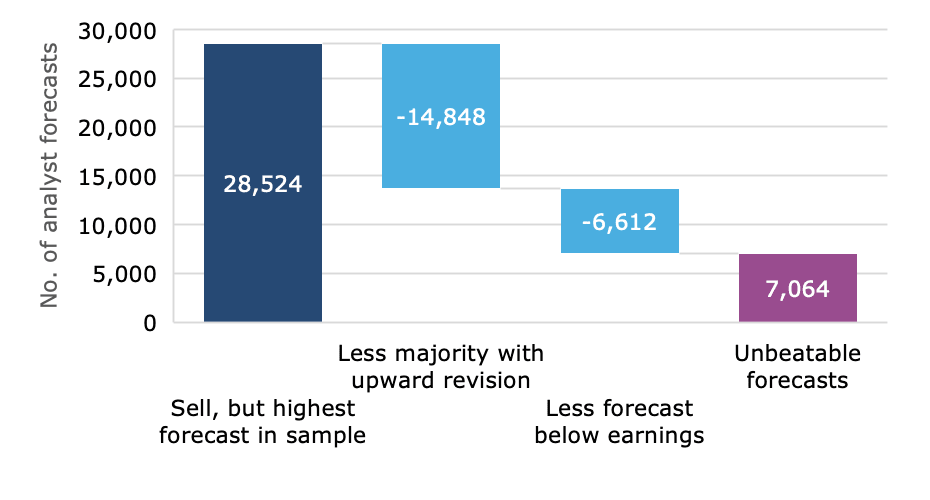 Затем они находят случаи, когда большинство аналитиков, оценивающих фирму, сделали пересмотры в сторону повышения, когда компания в конечном итоге превзошла прогнозы медвежьих аналитиков в любом случае, и в конечном итоге получили 7,064 "непобедимых прогнозов" (только около 5% всех медвежьих прогнозов аналитиков).