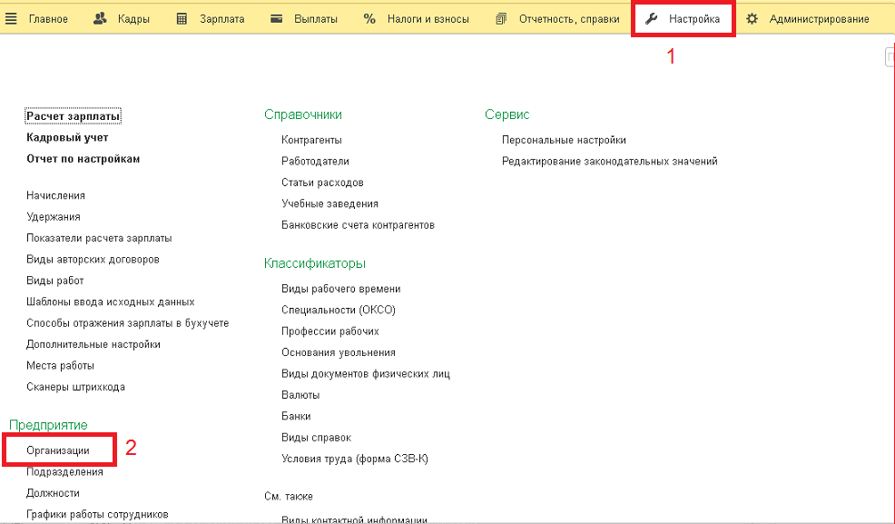 Вы являетесь пользователям программы 1:Зарплата и управление персоналом? И не знаете, как установить пониженный тариф страховых взносов в связи с Федеральным законом от 01.04.2020 № 102-ФЗ? Данный ФЗ устанавливает с 1 апреля 2020 года до конца расчетного периода 2020 года для страхователей, признаваемых субъектами малого или среднего предпринимательства пониженные страховые взносы. Следуем пошаговой инструкции: Выберите пункт главного меню «Настройка» (1), на открывшейся странице в разделе предприятие, нажмите выберете «Организации» (2)(возможно, у вас этот пункт будет называться «реквизиты организации»). Если открылся список организаций, выберете нужную и откройте ее двойным щелчком мыши. На закладке «Учетная политика и другие настройки» (3) выберите пункт «Учетная политика»(4). В открывшемся окне напротив надписи «вид тарифа» раскройте выпадающий список. Выберите последний пункт списка «Для субъектов малого или среднего предпринимательства». В полях «Применяется с» и «Меся
