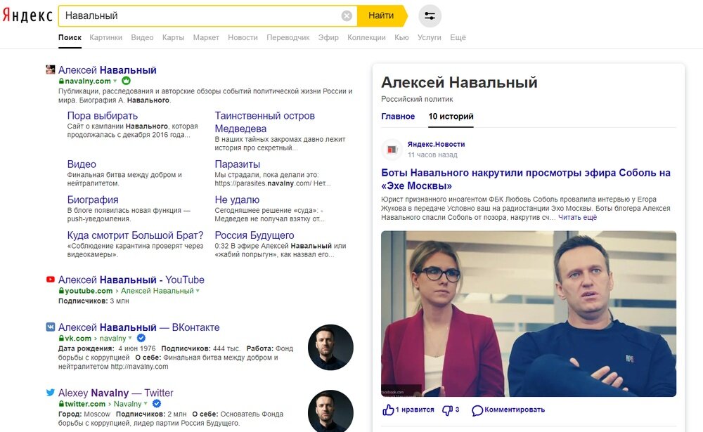 - Навальный, что внаглую пользуется накруткой, возмущен тем, что поисковик на запрос "Алексей Навальный" выдал свежую новость о накрутке на эфире Соболь.