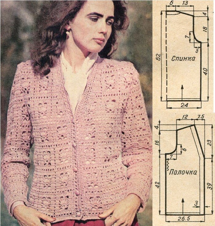 Квадраты узора распределяем симметрично по деталям. Сначала вяжем ряд столбиков с накидом, а затем переходим на узор. Законченные детали отглаживаются и сшиваются по швам, не вшивая рукавов. Жакет обвяжите по всем линиям следующим узором: