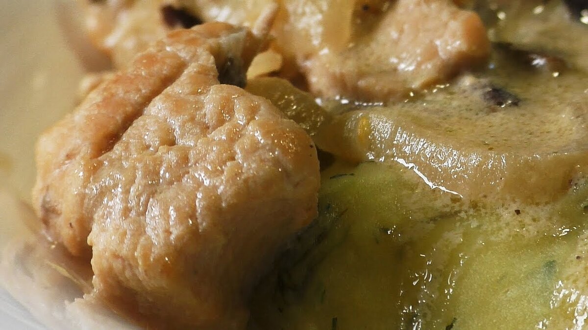 600 г индейки,50 г маргарина,2 головки репчатого лука,3 стакана мясного бульона,по 25 г измельчённой зелени петрушки и укропа,10 г молотого черного перца, соль - по вкусу. Подготовленную тушку индейки разрубить на порционныекусочки,посолить и обжаривать в течении получаса. Добавить очищенный и измельченный лук и продолжать жарить до золотистого цвета. Индейку с луком выложить в огнеупорные глиняные горшочки, залить горячим процеженным бульоном, посыпать молотым перцем,накрыть крышками, поставить в разогретую духовку и тушитьна слабом огне в течение 30-60 минут. При подаче к столу горячее блюдо посыпать зеленью петрушки или укропа.