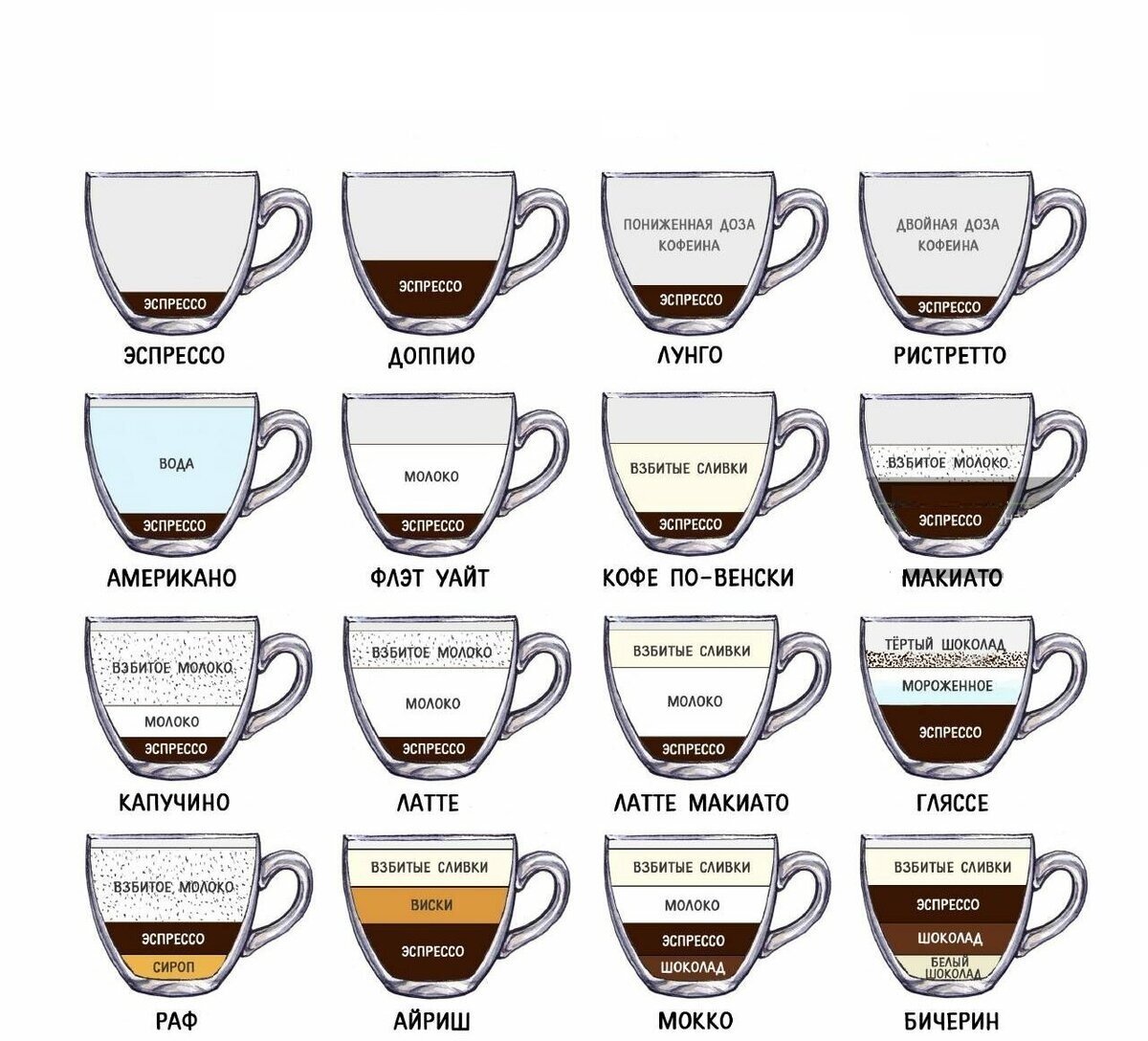 Сегодня культура употребления кофе развивается быстрее, чем когда либо. Кофейни есть буквально в каждом городе по всему миру. Пить кофе не только модно, но и полезно, если не превышать допустимой суточной дозы. А так как вкусовые приоритеты у миллионов людей, пьющих кофе отличаются друг от друга, то сегодня существует несколько десятков вариаций кофейного напитка. Первым по известности, будет эспрессо – основной компонент всех кофейных напитков. Представляет из себя крепкий черный кофе с пенкой, объем от 30 до 60 мл. Американо – все тот же эспрессо, но разбавленный горячей водой в пропорции 1 к 2 или 1 к 3. Капучино – эспрессо со взбитым в пену молоком, кофе вливают в молоко. Латте – Эспрессо с горячим молоком и пенкой сверху, при приготовлении молоко вливают в кофе. Обычно подается в большом бокале. Ристретто - эспрессо, в котором отношение массы напитка к массе перемолотого зерна ниже, чем в обычном эспрессо. Для приготовления такого напитка требуется 7–11 г кофе на 15–20 мл вод