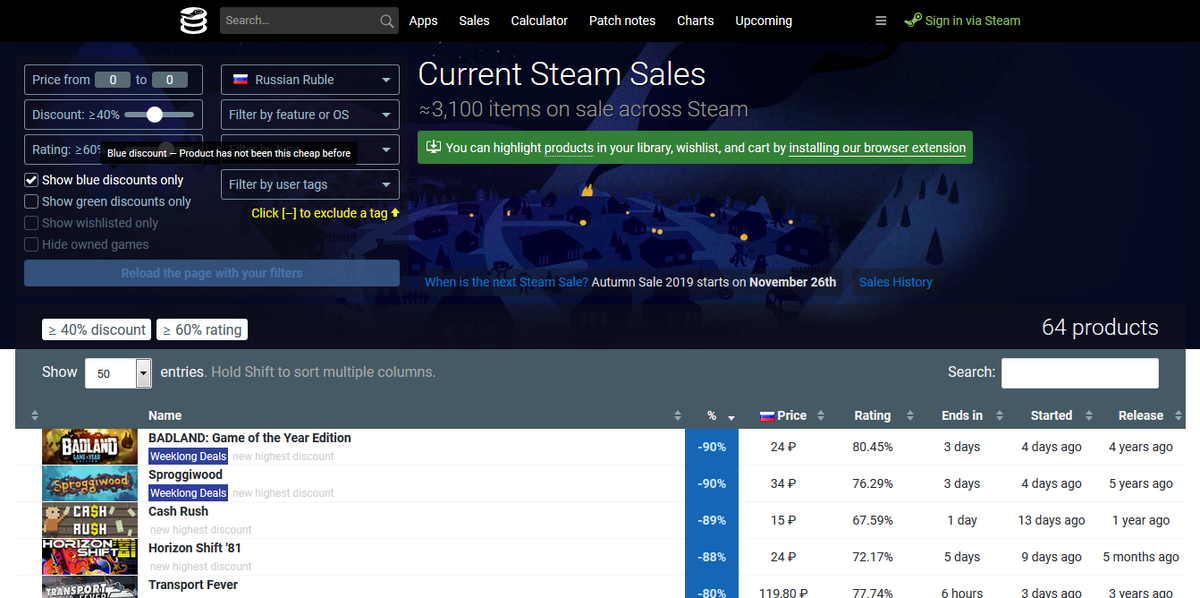 Несмотря на то, что в Steam появился раздел Steam labs, искать хорошие скидки на хорошие игры в Steam до сих пор сложно. Поэтому я использую поиск по скидкам в SteamDB - сервисе, который анализирует все активности в Steam и отслеживает изменение цен на товары. Когда начинается новая распродажа, неважно, недельная или крупная праздничная, нужно немного подождать пока скидки прогрузятся, пойти на Steamdb в раздел Sale и затем в настройке фильтров поставить галочку напротив строки Show blue discounts only. Так мы получим список продуктов, которые не получали ранее такой большой скидки, как сейчас. Остается лишь поставить сортировку скидок от самой большой и искать интересные игры. Да, шлака будет много, но благодаря мощному фильтру вы сможете сократить его появление в выдаче в разы. На мой взгляд, это намного удобнее чем все фильтры Steam и рекомендую использовать именно этот поиск, тем более, его можно синхронизировать с аккаунтом Steam. Надеюсь этот блог помог вам узнать что-нибудь