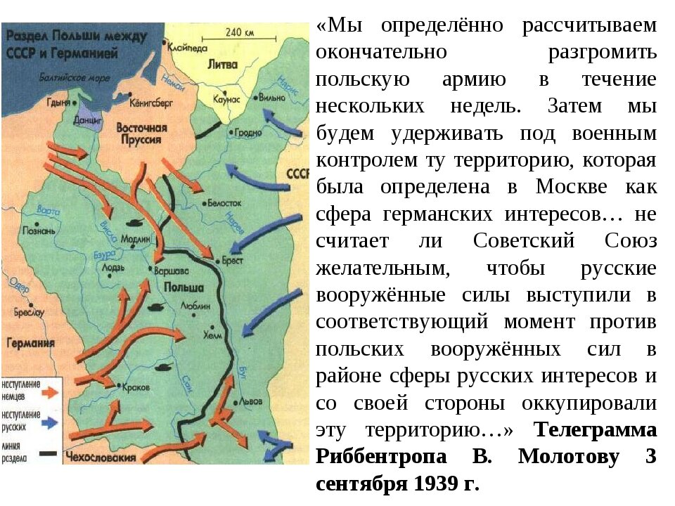 КАК СССР И ФАШИСТСКАЯ ГЕРМАНИЯ ПОЛЬШУ ДЕЛИЛИ В 1939 году между СССР и Немецко-фашистской Германией был заключен мирный договор ( пакт о не нападении). Так же по этому договору Польша была поделена между этими странами. Так называемый Польский поход Красной армии (17 сентября — 5 октября 1939 года) , советское вторжение в восточные области Польской республики стало их присоединение к Украине , Белоруссии и Литовской республике (как часть Виленского края). Тем самым разделив Польшу между СССР и Германией, по секретному договору. Операция Красной Армии началась через 16 дней после начала войны между Германией и Польшей. И не сопровождалась обьявлением войны. 17 сентября 1939 года представителем НКИД СССР польскому послу в СССР Вацлаву Гржыбовскому была зачитана и вручена нота, где ввод советских войск объяснялся необходимостью «защиты жизни и имущества населения Западной Украины и Западной Белоруссии».