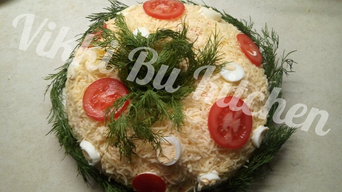 Несмотря на то, что в салат идет майонез, в нем все же чувствуются свежие нотки, а определенного шарма ему придает пикантная корейская морковка. Количество порций: 10