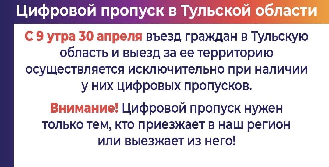 Правительство Тульской области усиливает контрольно-пропускной режим на дорогах в регион. Передвижение не блокируют, но, чтобы пересечь границу области, нужен будет пропуск, оформленный через портал «Госуслуги». С 9.00 30 апреля 2020 года при пересечении границы Тульской области вам понадобится электронный пропуск. Вы можете его оформить лично или за вас это может сделать работодатель. В первом случае действие пропуска распространяется на 24 часа, во втором пропуск будет постоянным. Для личного оформления документа для поездок на работу вам понадобится справка от работодателя, что вы действительно являетесь сотрудником компании. Если ваша работа связана с постоянными перемещениями (вы – водитель или курьер) – то потребуется еще одна справка, что ваша работа связана с перемещениями. Пропуск вместе с паспортом надо будет предъявлять по требованию полицейского или сотрудника Росгвардии. Выборочно могут производиться заборы для лабораторных исследований. Сотрудники полиции, дежурящие на