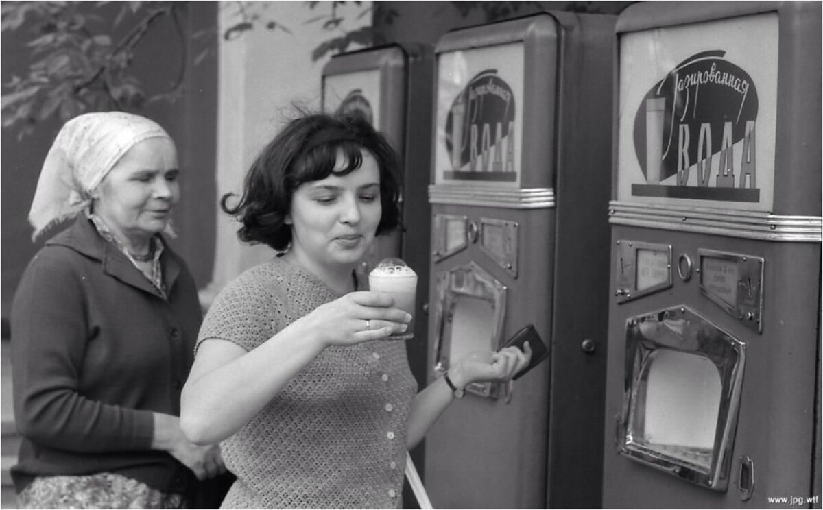 Сейчас, когда полки магазинов пестрят разнообразными прохладительными безалкогольными напитками, современной молодежи, наверное, очень трудно понять, почему такой популярностью пользовался этот старый, добрый аппарат с газированной водой... Газированная вода без сиропа - 1 копейка, с сиропом - 3 копейки. Автомат был оснащен водоохладительным устройством и сатуратором - аппаратом для насыщения воды углекислым газом. Причем все пользовались одним общим граненым стаканом. На этой фотографии видно, как его мыли - переворачиваешь вверх дном, ставишь в специальную выемку и нажимаешь - стакан промывается изнутри струей воды. Интересно, что сатуратор был изобретен шведским химиком Торберном Бергманом еще в 1770 году. Через 13 лет его усовершенствовал немец Якоб Швепп, который с юности мечтал создать безалкогольное шампанское. В 1783 году он изобрел промышленную установку для производства газированной воды. Швепп тогда проживал в Швейцарии и там начал продавать свой напиток. Потом он сообразил