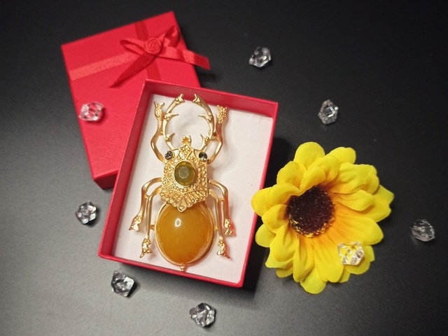 Анималистичные броши не выходят из модных трендов и, пожалуй, имеют уже право называться классикой. Аксессуары в виде насекомых добавляют образу необычные ноты, эпатажность, загадочность. Я неровно дышу к необычным брошкам, поэтому золотой жук-олень мне сразу приглянулся. В магазине из двух цветовых вариаций выбрала жёлтый, он показался более весёлым и естественным. Доставка заняла полтора месяца. Моё золотое насекомое приехало в яркой подарочной коробке. Размер жука 8.5*5см. Весит довольно много, поэтому на лёгких летних тканях он вряд ли будет удобно сидеть, а вот на материалах, которые смогут сохранить свою форму под его весом, выглядит просто сногсшибательно Материал: цинковый сплав, покрытый золотой краской. Спинка жука выполнена из смолы янтарного цвета, украшена искусственным зеленым камнем и стразами. На спине, лапах и рогах имеется узор. Аксессуар изготовлен аккуратно, все элементы ровные. Металлическая поверхность имеет приятный золотой блеск , камни хорошо заполированы. Бр
