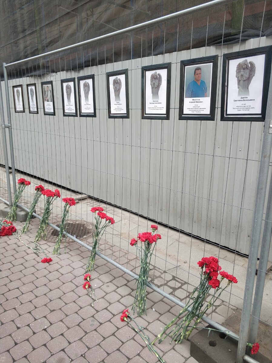 На Малой Садовой улице в Петербурге сегодня появилась стена памяти медицинских работников, погибших от коронавирусной инфекции. Девять рамок размещены на строительном заборе напротив здания комитета по здравоохранению Петербурга. Инициатива принадлежит активистке Ирине Масловой. Около этого стихийно возникшего самодельного мемориала останавливаются люди, рассматривая фото и читая имена. Также увидела там нескольких репортеров, снимающих материалы о стене памяти.