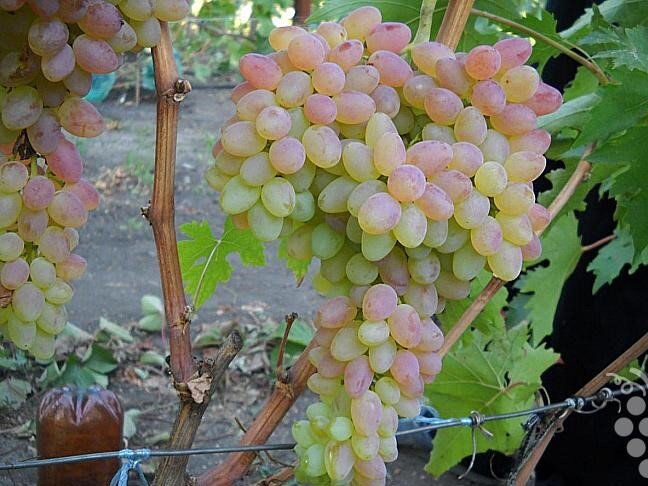 Выбирая сорта винограда для обзора,я решила остановиться на гибридной форме Черная орхидея и кишмише Лотос.Ничего общего между этими сортами нет,если не считать,что это виноград.А объединила я эти сорта с цветочными названиями просто для того,что бы вам было интересно.Вот на фото бессемянный сорт винограда,выведенный на Анапской ЗОСВиВ.Сорт раннего срока созревания,родительская пара Криулянский Х Янги ер.Цветок обоеполый.Грозди крупные и средние,ширококонические,средняя масса 380 грамм.Ягоды средние,бессемянные,овальные,розовые.Кожица тонкая,но прочная.Мякоть мясисто-сочная,вкус приятный.Лотос хорошо набирает сахар до 20%.Виноград среднерослый.Устойчивость к болезням и морозу повышенная.Сорт Лотос пригоден для потребления в свежем виде и для сушки.Этот розовый красавец имеет хорошие характеристики,из недостатков пожалуй это мелкая ягода,всего 2,5 грамм и то,что виноград относится к 4 классу,встречается довольно крупные рудименты. Черная орхидея,название подходит этой достойной форме о