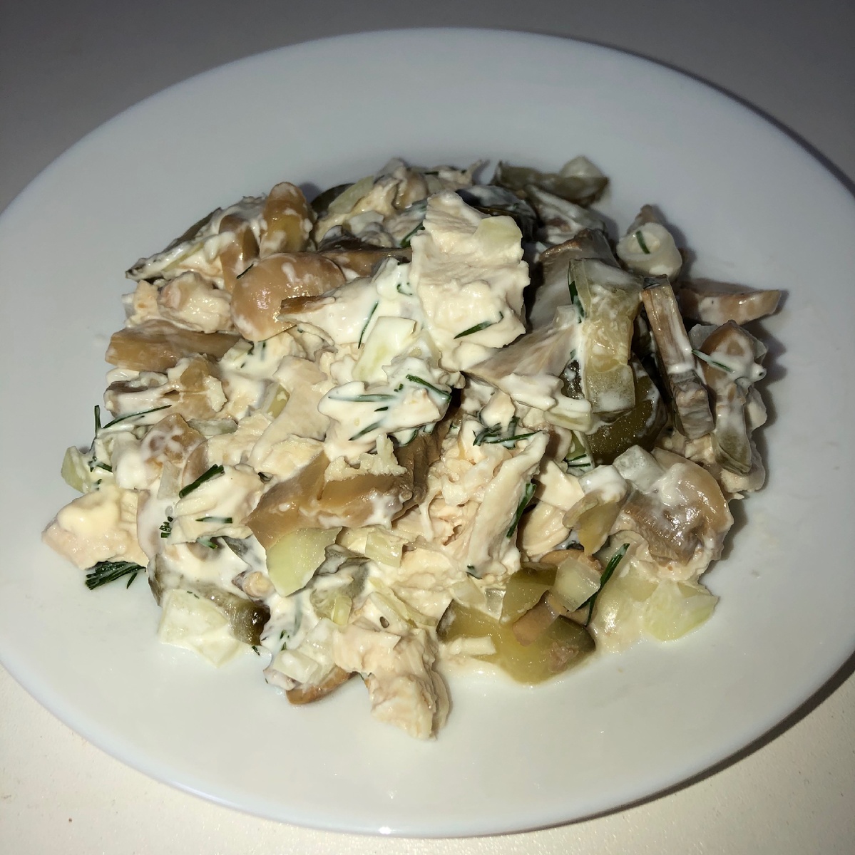 Салат получается очень сытным, нежным, и простой в приготовлении. Ингредиенты: Шампиньоны консервированные 1 банка Маринованные огурцы 2 шт Филе куриное 400 гр Майонез Укроп 20 гр Лук 1 средняя головка Соль, перец Приготовление: Филе курицы отвариваем, солим, перчим по вкусу, нарезаем. Шампиньоны нарезаем средних размеров, не мелко. Огурцы режем мелко, аккуратно выжимаем лишний сок, добавляем к курице и грибам. Укроп и лук мелко рубим, добавляем в салат и заправляем майонезом, всё хорошо перемешиваем и можно подавать. Приятного аппетита!