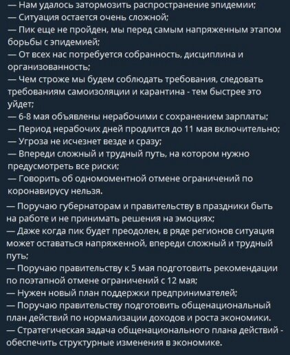 Сегодня 28.04.20 Президент очередной раз выступил с обращением перед населением. Однако народ воспринял новость очень скептически, а скорее они и вовсе разочаровались. Понятно, что главной новостью стало продление карантина, что было очевидно, но было и сказано ещё много интересного. Предлагаю вам ознакомиться с основными тезисами, ниже в скриншотах, и в принципе станет понятно разочарование населения. Очевидно, все внимание приковано к поддержанию экономики, а о поддержке населения ни слова, одни общие слова. Люди оставшиеся в тяжёлом положении явно ни это хотели слышать. Исходя из этого, можно смело прогнозировать всплеск оппозиционных сил и настроений, что ещё более негативно скажется на репутации власти.