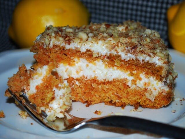 Заглянула в свою старую кулинарную тетрадку и увидела рецепт "Морковного торта", решила испечь, вспомнить молодые годы. Получилось! Да, да не морщите носик, он совсем не так плох,как кажется от названия. Хочу поделиться рецептом. Взбиваем в пену 2 яйца и 1,5 стакана сахарного песка, добавляем 250 грамм растопленного, не горячего сливочного масла, продолжаем взбивать, затем добавляем 1 чайную ложку гашеной соды, 1,5 стакана муки и замешиваем тесто, по консистенции тесто должно быть, как на оладьи. Если тесто получилось жидковато, добавляем ещё муки. Натираем на крупной тёрке морковь(нужен 1 стакан) и цедру 1 лимона, можно ещё добавить корицу, но это уже по желанию. Аккуратно перемешиваем морковь с тестом. Выкладываем в форму и выпекаем при температуре 180 гр 25 - 30 минут. Готовность проверяем прокором деревянной палочки. Для этого тортика хорошо подходит сметанный крем, придаёт лёгкости. Сметанный крем я делаю так : 1 стакан сметаны 20% жирности взбиваю миксером на слабых оборотах мин