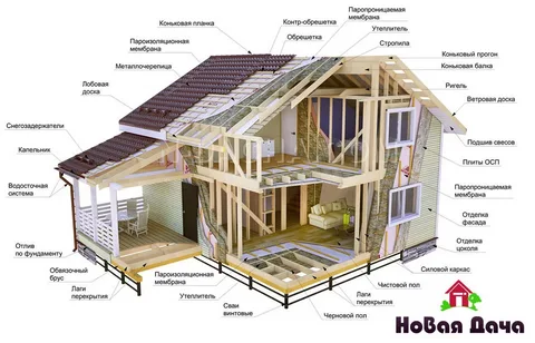 В отличие от бревенчатых домов, в которых несущими элементами являются стены. В каркасных зданиях эту функцию выполняет остров из цельной или клееной древесины. Снаружи и внутри каркас обшивается листовым или погонажным материалом, а изнутри заполняется утеплителем. Существует несколько вариантов сборки каркаса: точкой отсчета может стать пол, на который устанавливаются вертикальные элементы или стоечно-балочная конструкция, опирающаяся на фундамент. Чаще всего применяется каркас, состоящий из нижних и верхних обвязок стен, стоек и балок, подкосов жесткости, а также вспомогательных элементов – промежуточных стоек и ригелей, между которыми располагаются дверные и оконные рамы. На фундамент или цоколь, поверх гидроизоляционного слоя, укладывается и крепится при помощи стальных анкеров нижняя обвязка, сделанная из тщательно высушенных и антисептированных брусьев хвойных пород. Фиксируются несущие и угловые стойки. Поперечное сечение последних должно быть не менее 5 кв.см., длина определ