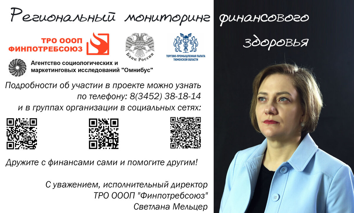 Тюменское региональное отделение Общероссийской общественной организации потребителей "Союз защиты прав потребителей финансовых услуг" анонсировало проведение в мае-июне 2020 года полномасштабного мониторинга финансового здоровья населения Тюменской области, который пройдет в рамках реализации программы “Социальная Финансовая Инициатива”. Напомним, что эта инициатива, разработана как ответ на сложную экономическую ситуацию, вызванную пандемией COVID 19, и подразумевает реализацию комплексной программы, направленной на защиту финансового здоровья жителей региона в условиях нарастающего глобального экономического кризиса. Программа, разработанная тюменскими экспертами в сфере финансовой грамотности, включает в себя в себя работу по пяти ключевым направлениям: 1. Региональный мониторинг финансового здоровья населения Юга Тюменской области; 2. Бесплатная юридическая консультация граждан по вопросам финансовых услуг; 3. Образовательные курсы и тренинги для взрослого населения, в том чис