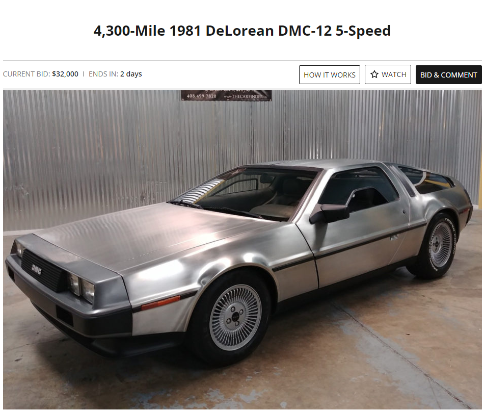 Зайдя на сайт Bring a Trailer можно увидеть любопытный лот: Текущая ставка — $32 000. Как сообщает владелец: После 25 лет длительного хранения автомобиль был куплен продавцом у семьи первоначального владельца во Флориде в июле 2018 года. Мощность обеспечивает 2,85-литровый PRV V6 в паре с пятиступенчатой механической коробкой передач. Кузов выполнен из нержавеющей стали над базовым шасси Lotus. Владелец продуманно подошел к продаже и сделал многочисленные фото машины. В комплекте с DeLorean идут кроссовки с автошнуровкой, летающий скейтборд, кепка и другие атрибуты из фильма, вроде «газеты будущего» 2015 года. В подарок также идет Альманах: Аукцион завершится 30 апреля. Комментарии под лотом: kobe-sean: Обожаю эти машины.. Спинка похожа на Ламбо.. что-то в этом роде.. ND4SPD: Прошло почти 30 лет после того, как я посмотрела эти фильмы, и я все еще хочу их посмотреть. Это действительно потрясающие автомобили! Снимаю шляпу перед Джуджаро. AutoTraitor Ставок от @Calvin Klein не было?
