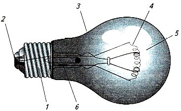 Рис. 1. Лампа накаливания: 1 — цоколь, 2 — контакт, 3 — стеклянная колба, 4 — нить накала, 5 — газ (аргон, криптон), 6 — предохранитель