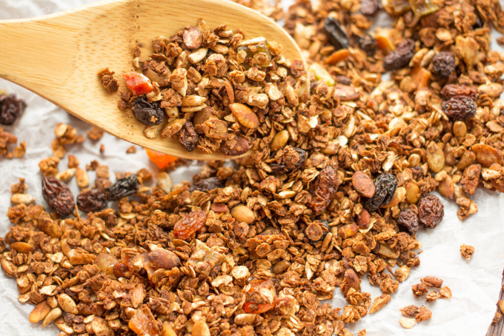 Надоела овсянка на утро? Давайте попробуем гранолу! Ингредиенты: Шаг 1 Духовку разогревает до 180 °C. Пока нагревается взбиваем белки до густой пенки, добавляем туда соль, корицу, растопленное сливочное масло и мед. Шаг 2 Еще раз тщательно все это взбиваем . Шаг 3 Орехи порубить на крупные кусочки (они должны быть сырые). Это могут быть фундук, кешью, миндаль, грецкие орехи. Сойдут какие есть. Шаг 4 Смешиваем орехи и овсяные хлопья в большой таре, добавить белковую массу и очень хорошо перемешать. Все компоненты смеси должны быть «смазаны» белковой массой. Шаг 5 Противень покрыть бумагой для выпечки, смазать его растительным маслом, выложить в один слой овсяную смесь. Запекать 15 минут. Через 15 минут смесь хорошо перемешать деревянной лопаткой. Шаг 6 Снова поместить противень в духовку, запекать до золотистого цвета, при этом перемешивая смесь через каждые 5–7 минут. В итоге она должна быть равномерно золотистой. Шаг 7 Когда смесь готова, достаем противень из духовки, даем граноле
