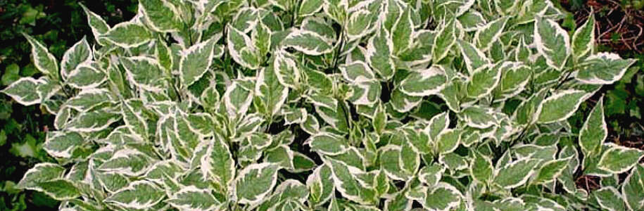 Дерен белый «Элегантиссима» (Cornus alba «Elegantissima», лат.) – крупный декоративный кустарник, вырастающий до трех метров в высоту, с раскидистой кроной (до 5 метров). Характерные внешние черты: пестрая широкая листва (до 12см длинной), сизо зеленого цвета с белым окаймлением, насыщенно красные побеги, мелкие желто-белые цветы (соцветия щитковидные) и синевато-белые плоды. С приходом же осени цвет листвы меняется на темно-фиолетовый, что придает кустарнику более элегантный вид и усиливает цветовой акцент создаваемых с его участием композиций. Жизненный цикл дерена "Элегантиссима" Элегантиссима является долговечным кустарником (жизненный цикл более 50 лет), который начинает цвести и плодоносить к достижению двух или трехлетнего возраста. Особенно обильно цветение протекает в первой половине летнего периода и начале осени, именно в это время созревают и плоды растения (несъедобные). Правильный уход за кустарником сорта "Элегантиссима" Молодая поросль появляется довольно быстро. В ос