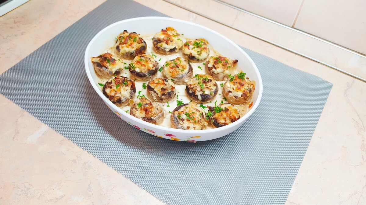Шляпки грибов плотно начиняю подготовленной начинкой.