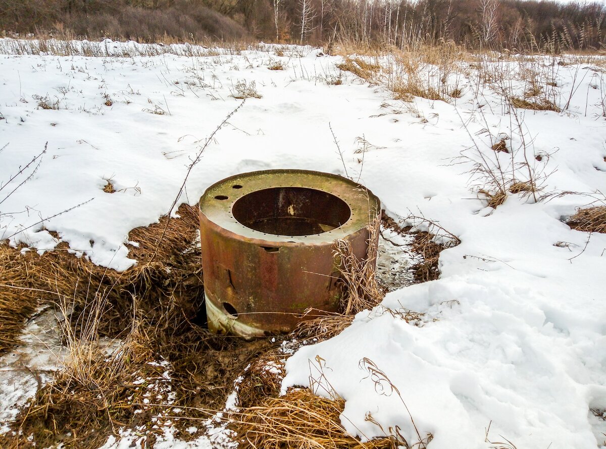 Мы продолжали идти по опустевшей деревне, аккуратно стараясь наступать на снег. Ведь в таких деревнях запросто могут быть открытые колодцы, погреба или выгребные ямы. Зимой их может припорошить снегом, и запросто можно наступить и провалиться. Прошли немного по деревне и увидели странную металлическую бочку, которая была врыта в землю. Верхний ее край выступал из земли. Мы подошли к бочки поближе, заглянули в нее. Внутри была вода. Скорее всего, это был колодец. А может, даже и скважина. Странно то, что вода в этом колодце не замерзла, хотя температура была минусовая. А вы как думаете, друзья, что это могло бы быть? Мы еще немного прошли по деревне, и вскоре увидели очередной заброшенный дом. От него осталась только шлаковая стена и пустой оконный проем. Ни крыши, ни потолка у этого дома уже не сохранилось. Перед домом росла раскидистая сосна. Наверное ее посадили жители, чтобы отдыхать под сенью ее ветвей в летний зной. Но вот, к сожалению, деревня опустела, дом почти разрушен, а сосн