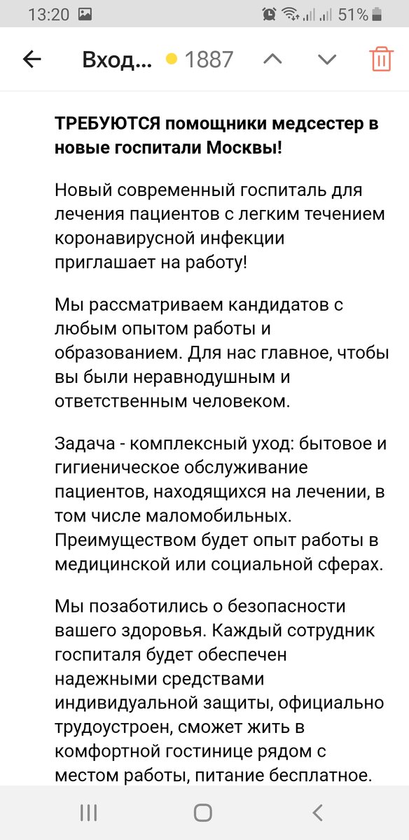 Буквально сегодня Центр занятости Москвы прислал мне письмо следующего содержания: Рабочий день - 24 часа (сутки через сутки) с 6-часовыми сменами и перерывами для отдыха. Зарплата - 50.000 до вычета налогов, оформление за один день. Ранее я была зарегистрирована в качестве безработной с пособием 1500 рублей, видимо, поэтому мне прислали эту вакансию. Я думаю, они имеют ввиду новый госпиталь в ТиНАО (Троицкий и Новомосковский административный округ) в Новой Москве, в деревне Голохвастово, который построили за один месяц. Кажется, в Москве ситуация с коронавирусом реально тяжёлая, если управляющие готовы брать людей без соответствующего опыта и образования. Вот что происходит, когда на самом деле требуется персонал: больше никаких сомнительных требований про "опыт 5 лет", "знание 3-х иностранных языков" и "высшее образование". И без вопросов на собеседованиях "кем вы видите себя через 10 лет", "почему пришли в нашу компанию". 43000 рублей на руки - это конечно неплохо в наше время. Но