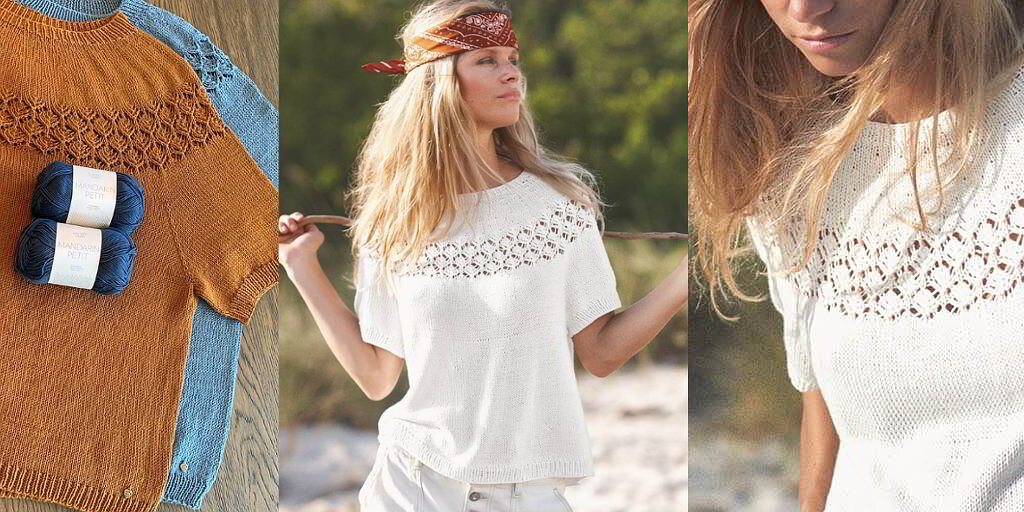 Женский топ от норвежского дизайнера Olaug Beate Bjelland для летней коллекции 2020 года Sandnes Garn вяжется в удобной технике сверху вниз, при которой можно легко отрегулировать длину. Вязание кокетки топа выполняется комбинированием круглой кокетки и реглана. По кругу кокетки проходит милый и свежий ажурный узор. Подъем ростка горловины выполняется за счет немецких укороченных рядов.