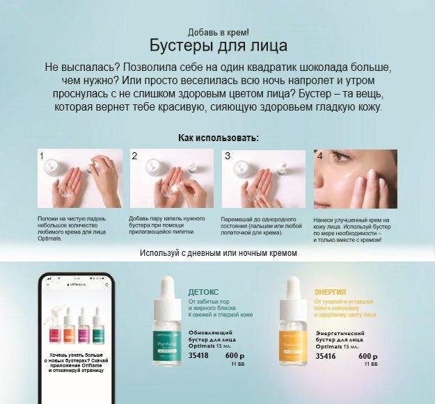 ПЯТЬ ВОПРОСОВ О БУСТЕРАХ Поисковики по слову «бустер» выдают детские автокресла, модные блогеры поют ему оды, а ты просто не понимаешь, как — и зачем — добавлять этот продукт в свой уход за кожей. Разбираемся вместе! ЧТО ТАКОЕ БУСТЕР? Это концентрированное средство решает проблемы, которые не типичны для твоей кожи на постоянной основе, а возникают здесь и сейчас как следствие образа жизни. Съела лишнюю шоколадку и проснулась с высыпаниями? Веселилась всю ночь, и наутро цвет лица тусклый? Бустер поможет быстро нормализовать кожу. ЕСЛИ У МЕНЯ ЕСТЬ СЫВОРОТКА, НУЖЕН ЛИ БУСТЕР? Сыворотка — это часть комплексного ухода, ты используешь ее каждый день, чтобы подготовить кожу к нанесению крема. Бустер добавляется в сам крем и используется однократно или курсом, когда нужен дополнительный уход с направленным действием. Он не зря продается в маленькой бутылочке: концентрация активных веществ гораздо выше, чем в сыворотке, и его нужно совсем немного. КАК И КОГДА ИСПОЛЬЗОВАТЬ БУСТЕР? Добавь па