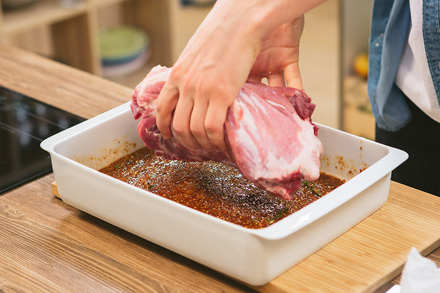 ЗАПЕЧЕННАЯ СВИНАЯ ШЕЙКА С КАРТОФЕЛЬНО-ЛУКОВЫМ ПЮРЕ И БИТЫМИ ОГУРЦАМИ