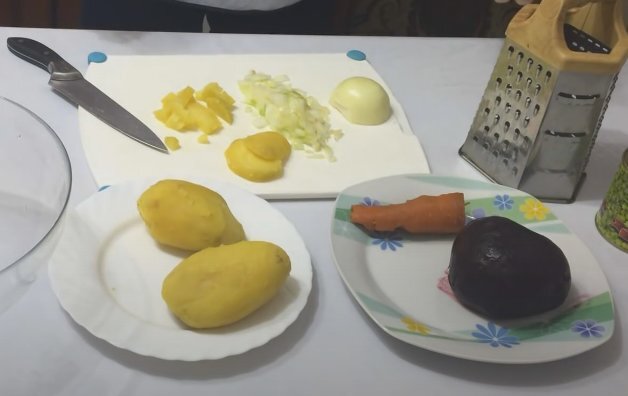 Отвариваю картофель, свеклу и морковь. Остужаю, очищаю от кожуры. Картофель и лук режу кубиком, свеклу и морковь тру на терке.