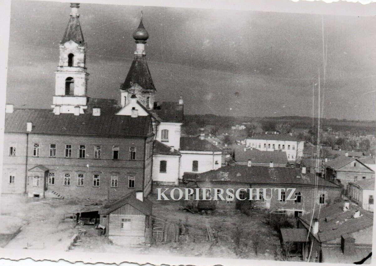 Фотография горящего города сразу после окончания уличных боев с памятником и прохожим. Подпись Порхов изначально вызвала сомнения в верной привязке продавцом.