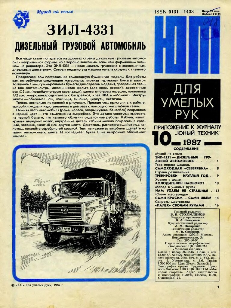 Решил взять старые выкройки модели из журнала Юный Техник за 1987 год. В прошлом данный журнал был очень популярен у любителей мастерить и вот спустя столько лет развертки попали ко мне, но правдоподобность зила оставляет желать лучшего! И вот я, не прибегая ко всяким 3d моделям и компьютеризации, а только с помощью линейки и карандаша, решил возродить бумажный зил 4331. Данный грузовик мне нравится тем, что на таком ЗиЛе ездил мой отец. Начнем с капота: я на готовой советской развертке немного видоизменил отверстия передней решетки: Затем собрал ее, сделав объемной и отдельной от самого капота, ведь на настоящем Зиле она именно что отдельно крепится к капоту, а в советском журнале она почему - то единое целое с капотом. А вот и старый капот в сравнении с новым: Далее под мой нож пошла сама кабина. Ее я тоже распилил в развертках на части, потому что и двери и окна тоже никуда не годятся в оригинальных развертках: Крышу тоже пришлось доработать, сделать ее объемной и добавить выштамп