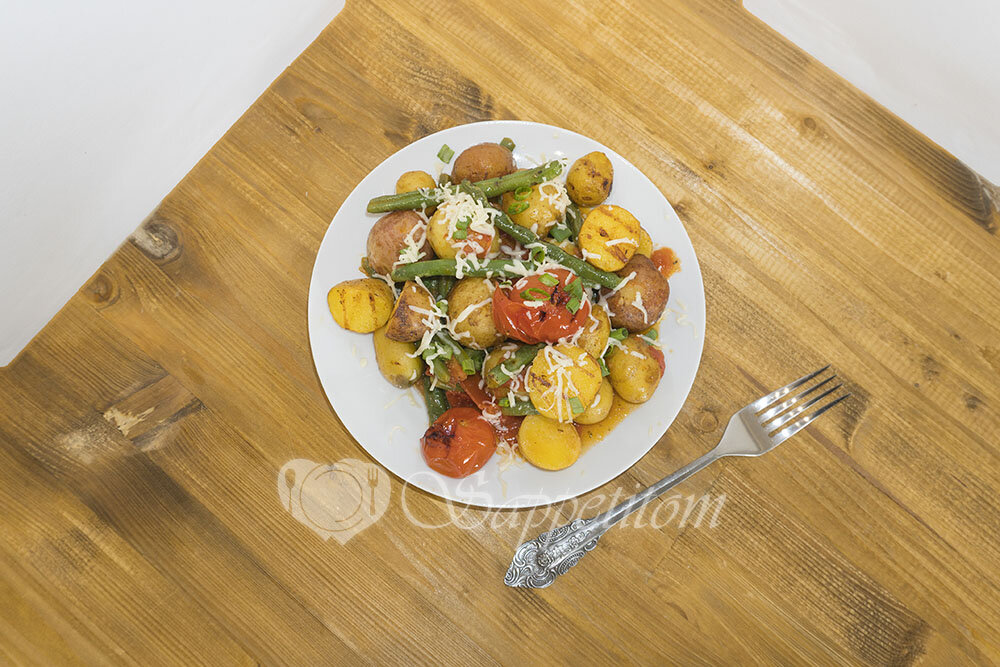 Нежный запеченный картофель с сыром и стручковой фасолью прекрасно подойдет для сытного ужина. А если взять молодой мелкий картофель и приготовить его прямо в кожуре, получится вообще невероятно вкусно. Несмотря на то, что я говорю о запеченном картофеле, готовить мы его будем на сковороде. И тут никак не обойтись без помидор. Выбирайте сладкие. Если не сезон помидор, лучше взять черри. У них более насыщенный вкус. Сыр подойдет любой твердый, который хорошо плавится, а стручковую фасоль берите какую найдете - и замороженная в этом блюде прекрасно будет себя чувствовать!