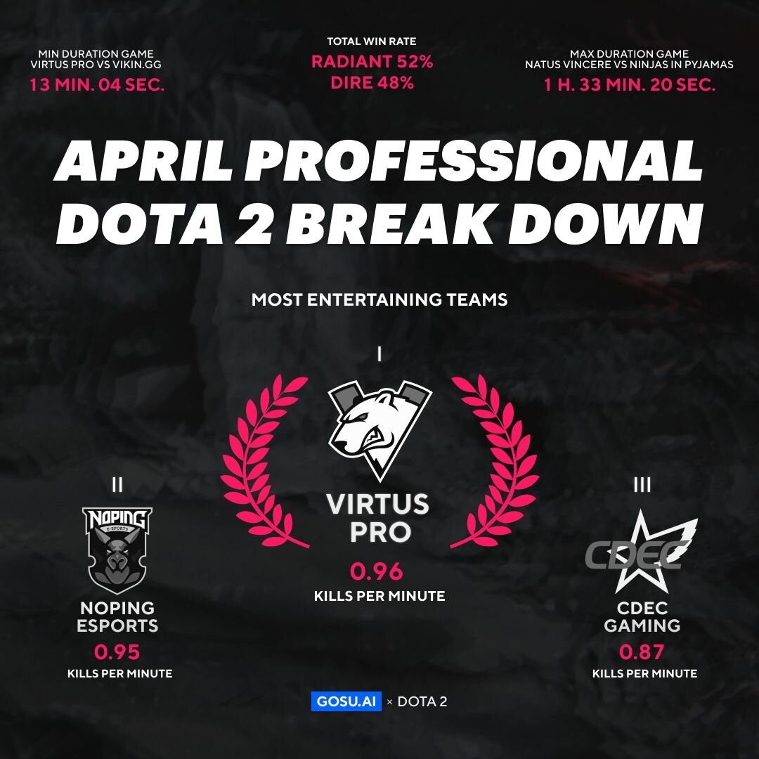 В сегодняшней инфографике мы хотели бы разобрать статистику профессиональных игр за апрель. Как всегда, мы хотим выделить лучшие команды, игроков и героев. Впервые в нашей инфографике мы видим Spirit Vessel среди пяти самых популярных предметов, стоимость от 2500 голды. Это не удивительно, ведь почти весь прошедший месяц мы неоднократно видели Timbersaw или Bristleback в множестве игр. Timbersaw, к слову, попал на первую строчку самых часто запрещенных и часто пикнутых+запрещенных героев месяца. С другой стороны, у нас есть Tinker, которого команды пикали или запрещали всего два раза за целый месяц. Похоже, бафф этого героя лишь вопрос времени. Нравится ли вам нынешняя мета? Каких героев вы бы хотели чаще видеть в профессиональных играх? Делитесь своим мнением в комментариях.