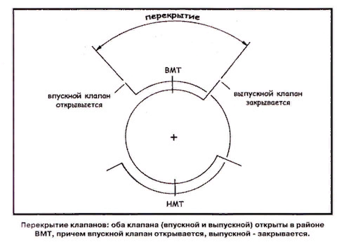 Когда поршень опускается в нижнюю мертвую точку(нмт) то открыты оба клапана, на небольшой промежуток времени. Таким образом отработанные газы под напором свежих лучше покидают цилиндр.