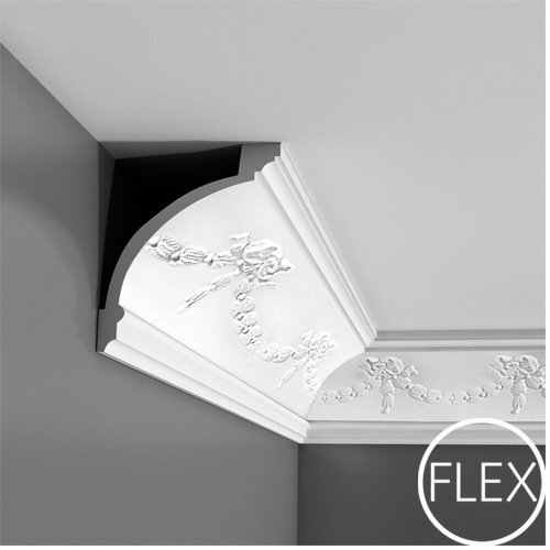Потолочный гибкий плинтус используется в тех ме стах, которые обладают сложной геометрией и стандартные прямые варианты декоративных украшений туда не подойдут. Если в помещении имеются округлые формы, сделана сложная часто преломляющаяся линия, то именно такие варианты будут наиболее подходящими. Нужный эффект достигается благодаря использованию