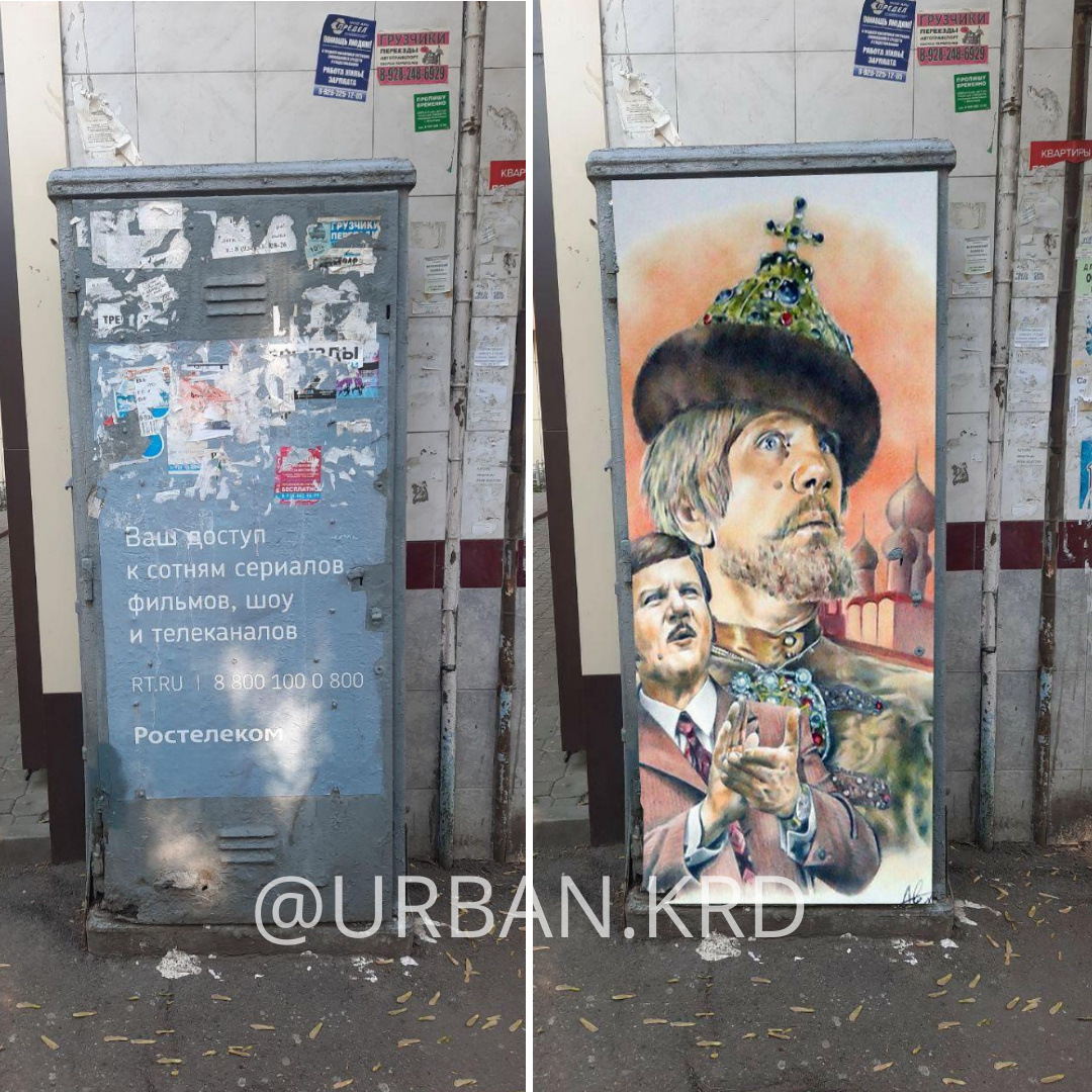 Недавно осознал, что в Краснодаре очень мало уличного искусства. Есть 5-7 классных графити на торцах домов, но как по мне для миллионика это очень и очень мало. И вот я подумал, а что если нам разукрасить электрощиты? Да, да, те самые ржавые серые электрощиты, сделав из них произведения искусства.И не просто разукрасить, а привязать принты на них к местности. В Челябинске местные урбанисты протолкнули эту идею Администрации и в результате получилась самая большая в России галерея современного искусства под открытым небом. Подготовил для вас визуализацию нескольких моих вариантов: 1.Электрощит с героями фильма Иван Васильевич меняет профессию рядом с кинотеатром Болгария. 2.Щит на входе в корпус КубГУ,где учился Галицкий. Несмотря на то,что Сергей Николаевич уже столько сделал для Краснодара в городе до сих пор нет ни одной памятки о нём. Ставить памятники при жизни и переименовывать улицы как-то против правил, а вот нарисовать портрет рядом с корпусом экономфак,где учился бизнесмен бы