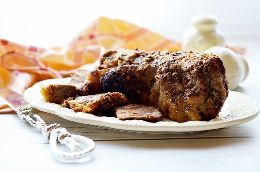Мясо помойте, обсушите. Я использовала мраморную говядину. Отлично подойдёт и свинина, и телятина. Обмажьте мясо горчицей, посолите, обваляйте в любимых специях.