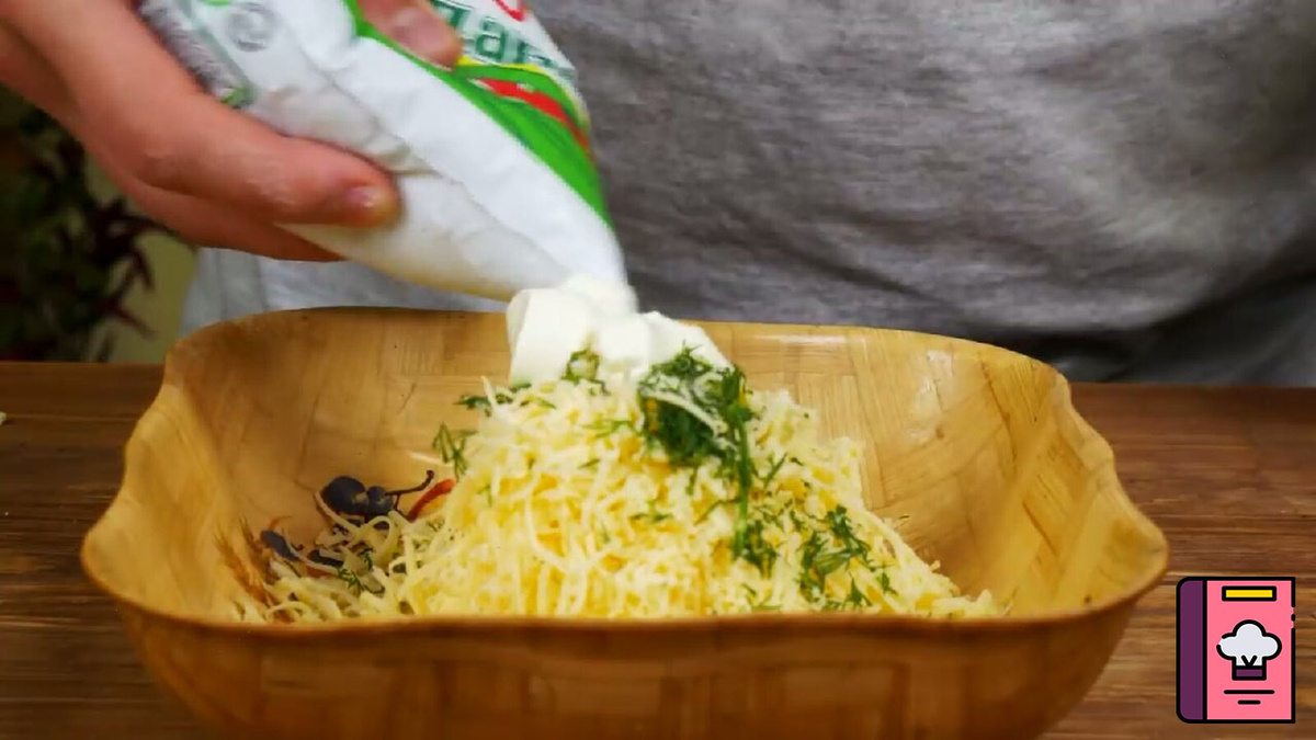 Всем доброго времени суток. Сегодня хочу вам показать быстрый и интересный метод приготовления хачапури. Наверное, это самый простой способ приготовить это блюдо. Сначала приготовим начинку. Берем зубчик чеснока, раздавливаем и мелко нарезаем его. Дальше берем укроп. Нам понадобится только верхняя его часть. Также мелко нарезаем его. Еще нам понадобится сыр. Берем терку и натираем его большое количество. Ссыпаем все в одну большую миску. Нужно немного посолить, и добавляем немного сметаны. Все это перемешиваем. Сметана выступает в роли клейстера. Благодаря ей, наша начинка не будет рассыпаться. Насыпаем на стол муки и берем дрожжевое тесто. Так как у нас быстрый рецепт, тесто мы купили в магазине. Вы конечное можете сделать его сами, так блюдо получится только вкуснее. Берем небольшую часть теста и скатываем в шарик. С помощью скалки раскатываем его в лепешку. Скатываем шарик из нашей сырной массы и кладем его посередине. Загибаем края лепешки и все это раскатываем скалкой. Кладем на