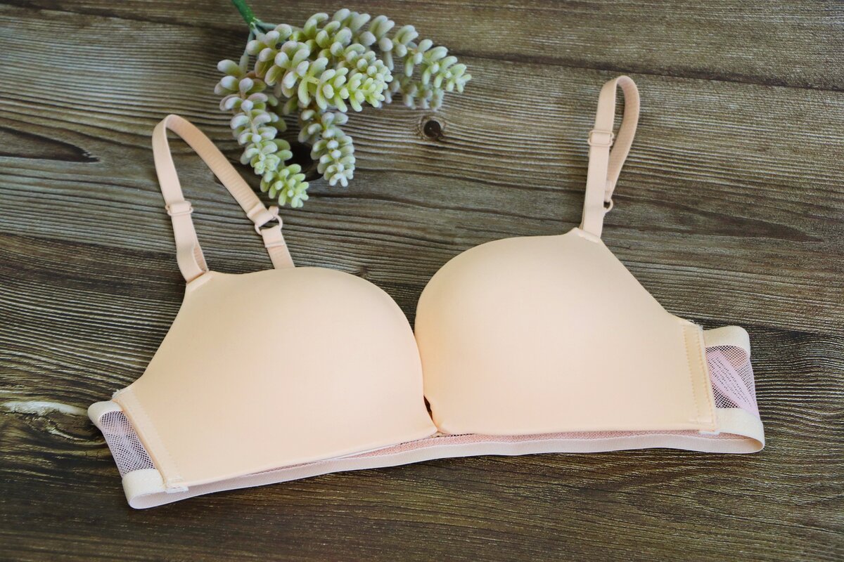 Ещё одна отличительная черта лифа - пластиковая застёжка спереди. Обхват не регулируется. Имеется вставки пушапа снизу чашечки. Сами чашки плотные, хорошо держат форму.