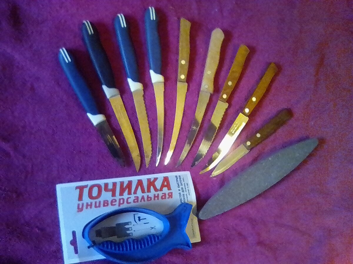 Пожалуй "велосипед изобретать" не нужно.Ножи производства Бельгии универсальный подход цены и качества для кухни Разделает даже курицу нож с ЗУБЧИКАМИ на лезвии из нержавеющей стали не требующий больше никогда заточки. Ручка дерево длина -210 мм,ручка пластмасса длина 225 мм -70 руб за шт. Нарезать тонко овощи для любимого салата поможет нож с узким лезвием и зубчиками, и точит не надо НИКОГДА Ручка дерево длинна ножа 210 мм,Ручка пластмасса длинна ножа 225 мм цена 70 руб. за шт. Нож универсальный БЕЗ ЗУБЧИКОВ С пластмассовой ручкой длина 225 мм,с деревянной ручкой длина 210 мм цена за шт 70 руб. Почистить картошку,да легко,взять в дорогу "милое дело",маленький,острый,не заменимый,без зубчиков на лезвии Ручка деревянная и ручка из пластмассы длина 170 мм цена 70 руб. шт. Ножеточка "рыбка" 2-3 легких провода по лезвию ножа и "вуаля" нож острый,как бритва,изделие разработано и имеет Российский патент. Пластины из прочного Вольфрамового сплава легко точат нож любой прочности стали.Стоимо