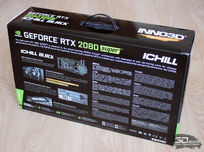 Коробка, в которой поставляется INNO3D GeForce RTX 2080 SUPER iChill Black, выглядит как огромный чемодан с ручкой, хорошо хоть, что весит она не так уж и много. На лицевой стороне приведено фото видеокарты, указано название компании-производителя и серии.