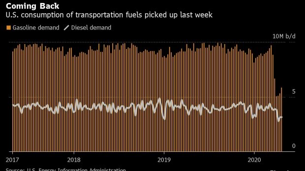 (Bloomberg) - Нефть продвинулась второй день в Азии на ранних признаках того, что спрос начинает восстанавливаться, в то время как производители сдерживают производство, чтобы противостоять глобальному перенасыщению. Фьючерсы в Нью-Йорке выросли на целых 6% после роста на 22% в среду. Запасы бензина в США упали на 3,67 млн. Баррелей по сравнению с предполагаемым ростом в 2,49 млн., Сообщило в среду Управление энергетической информации США. Недельный запас бензина, показатель спроса, вырос на 549 000 баррелей в день, больше всего с мая. Скидка на поставку нефти в июне относительно июльской структуры, известной как контанго, в среду сократилась до всего лишь 3,28 доллара за баррель после того, как во вторник она достигла 7,69 доллара за баррель, поскольку основные индексные фонды закрыли первый месяц. EIA также сообщила о меньшем, чем ожидалось, увеличении национальных запасов сырой нефти на 8,99 млн. Баррелей и о строительстве 3,64 млн. Баррелей в Кушинге, штат Оклахома, пункт поста