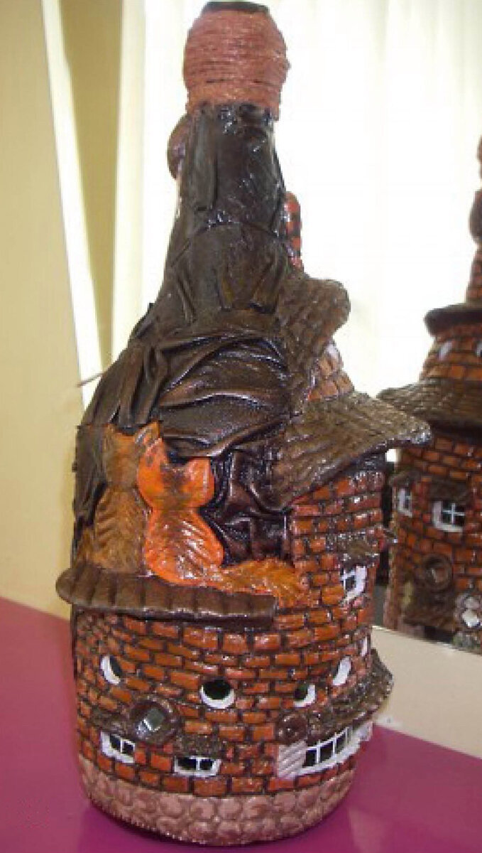 Здравствуйте, уважаемые читатели. Сегодня мы рассмотрим мастер классы по созданию домиков из соленого теста и кожи. Берем бутылку и соленое тесто (стакан муки, стакан соли и 125 мл. воды. Еще можно добавить немного растительного масла и немного клея ПВА) Тесто лепим не все сразу, а кусками, сделали лестницу и прорезаем дверь, такой штучкой которая в обычной жизни используется для маникюра. С помощью стэка поднимаем козырек над дверью. Хорошенько выравниваем, делаем что то похожее на кровлю, ставим колонны и украшаем их. С помощью линейки кладем кирпичи. Над дверью кладем шарик из соленого теста (кстати когда лепили дополнительные мелкие детали, предварительно смазывали клеем ПВА) Пуговкой с рифленым узором вдавливаем в шарик над дверью, пусть будет родовой герб над дверью. Получилось вот так. Замечательные штучки получаются с помощью обычного карандаша. Круглые окошки хорошо получаются с помощью колпачка от ручки. На крышу посадили котят. Долепили крышу формируя пальцами, прорисовали