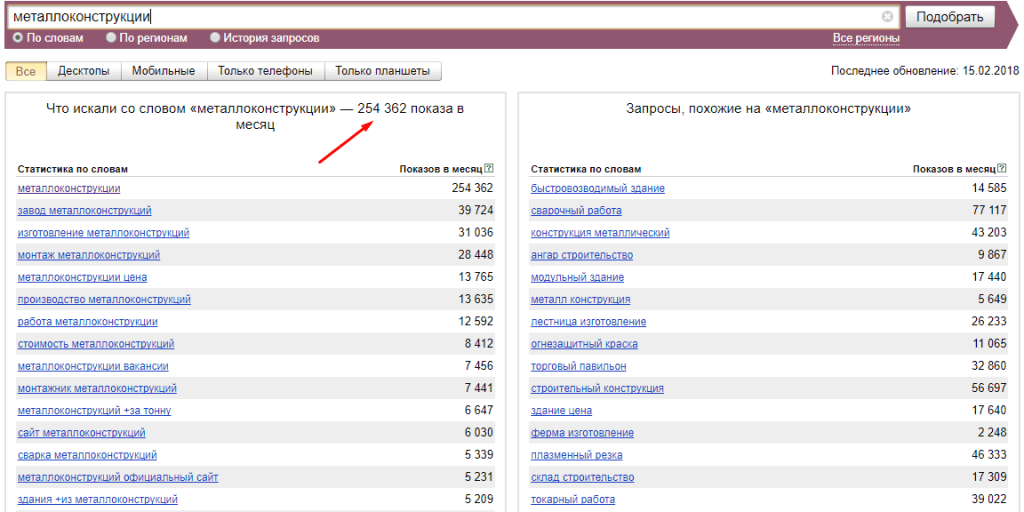 Если задать запрос в wordstat в таком виде – “!металлоконструкции” – мы получим самую точную частотность. То есть будет отображаться частотность данного слова именно в таком виде, как мы написали: