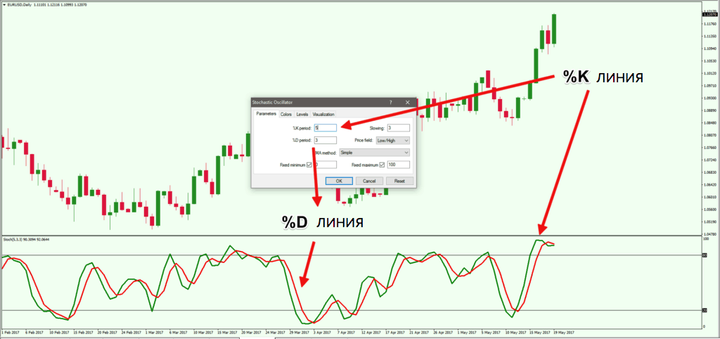 Если вы откроете настройки стохастика в любой платформе для построения графиков, например в MetaTrader, вы увидите, что индикатор рисует две отдельные линии, представляющие значения периодов %K и %D, которые рассчитываются по следующей формуле: