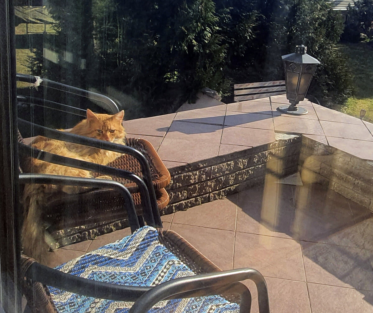 Утром Рыжик не стал пропускать свой завтрак. Наевшись, он не ушёл сразу, а улёгся на стул вздремнуть... Видимо, ночь была активная - не выспался.